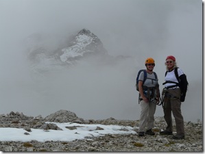 The higher we got the foggier it got – or perhaps we were just hitting the low cloud layer. For a time the fog hid the last part of the via ferrata from Anni. This consisted of two ladders up a sheer face of rock, the second of which has a reputation for pushing you backwards as the exit is over a bulge. It was also a bit disconcerting to see two people being belayed up the ladders We caught up to them later to discover that they were two Americans being guided but one of them had an artificial leg. We saw him struggling over the bulge but maybe he had an excuse. (That’s them in the background of our group shot.)
